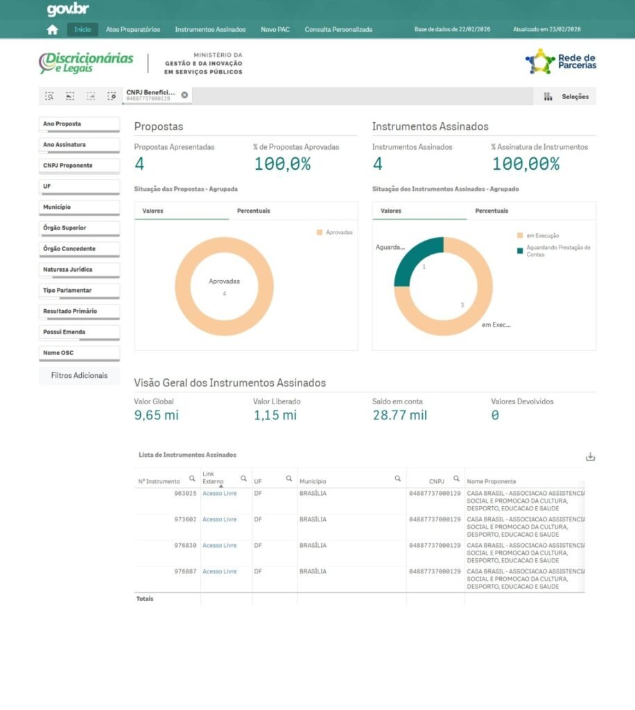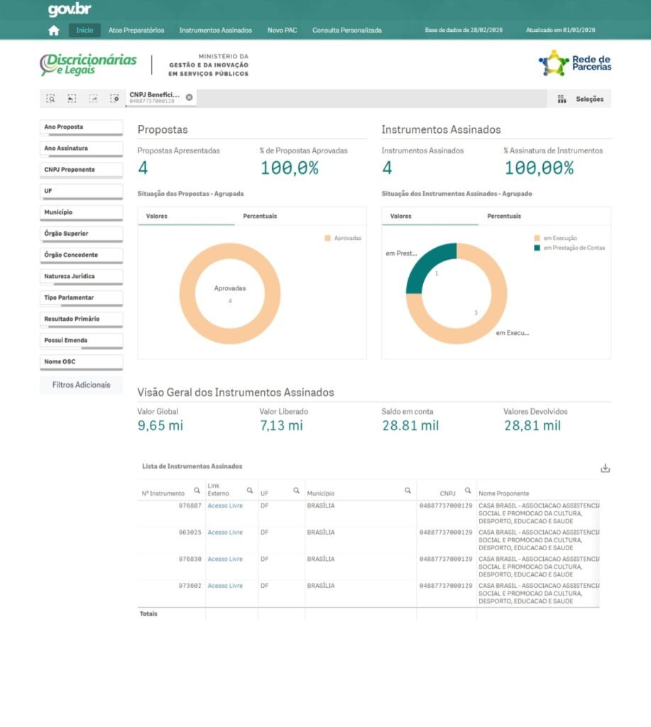 A Casa Brasil reafirma seu compromisso com a transparência e o controle social por meio da divulgação permanente das informações relativas às parcerias celebradas com a Administração Pública. Em atendimento à legislação vigente, são disponibilizados em seu sítio eletrônico os dados extraídos do Painel de Transparência de Emendas Discricionárias e Legais, contemplando as propostas apresentadas e os instrumentos assinados, permitindo o acompanhamento público da execução dos projetos, da aplicação dos recursos e dos resultados alcançados. Essa prática fortalece a governança institucional, amplia o acesso à informação e assegura à sociedade o monitoramento das ações desenvolvidas pela entidade.
